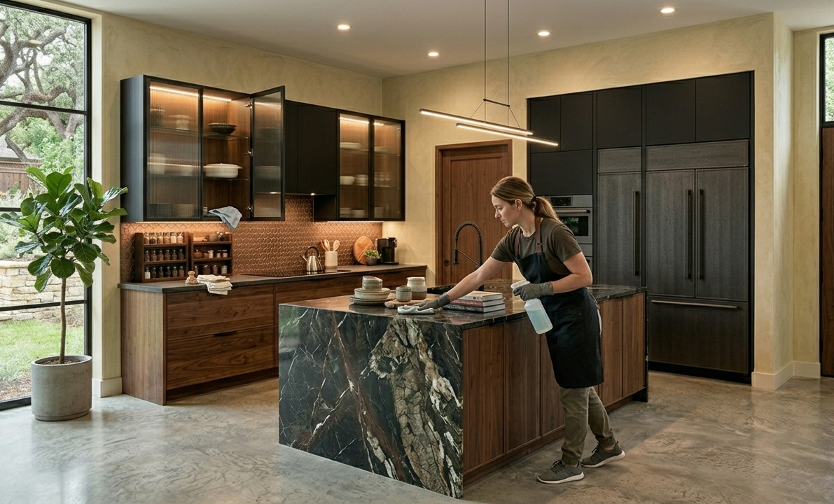 A thorough cleaning of the kitchen, including wiping down cabinets, backsplash, and appliances